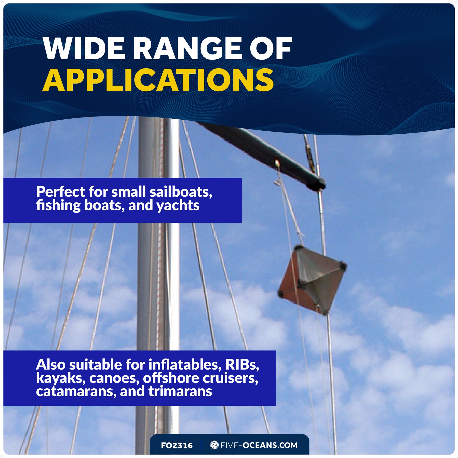 WIDE RANGE OF APPLICATIONS: Ideal for small sailboats, fishing boats, yachts, inflatables, RIBs, kayaks, canoes, offshore cruisers, catamarans, and trimarans.