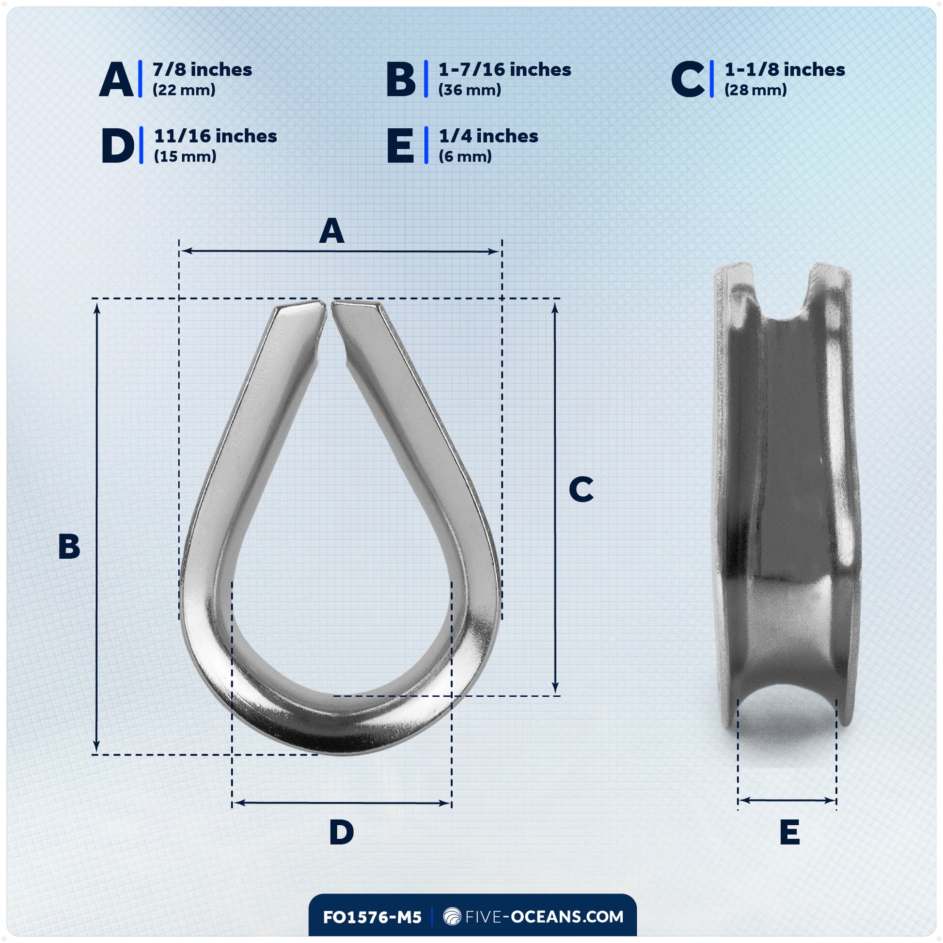 1/4" Wire Rope Thimble, AISI316 Stainless Steel, 5-Pack - FO1576-M5