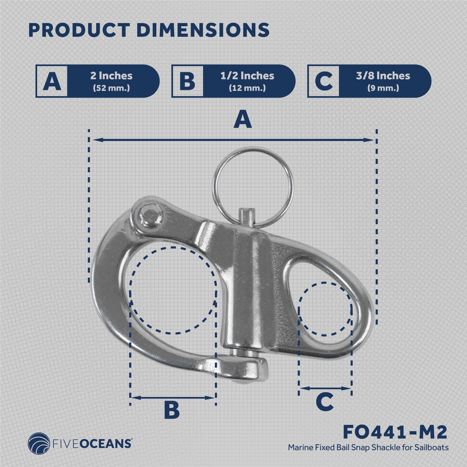 Length (A): 2 inch (52mm). Inside Diameter (B): 1/2 inch (12mm). Eye Inside Diameter (C): 3/8 inch (9mm)