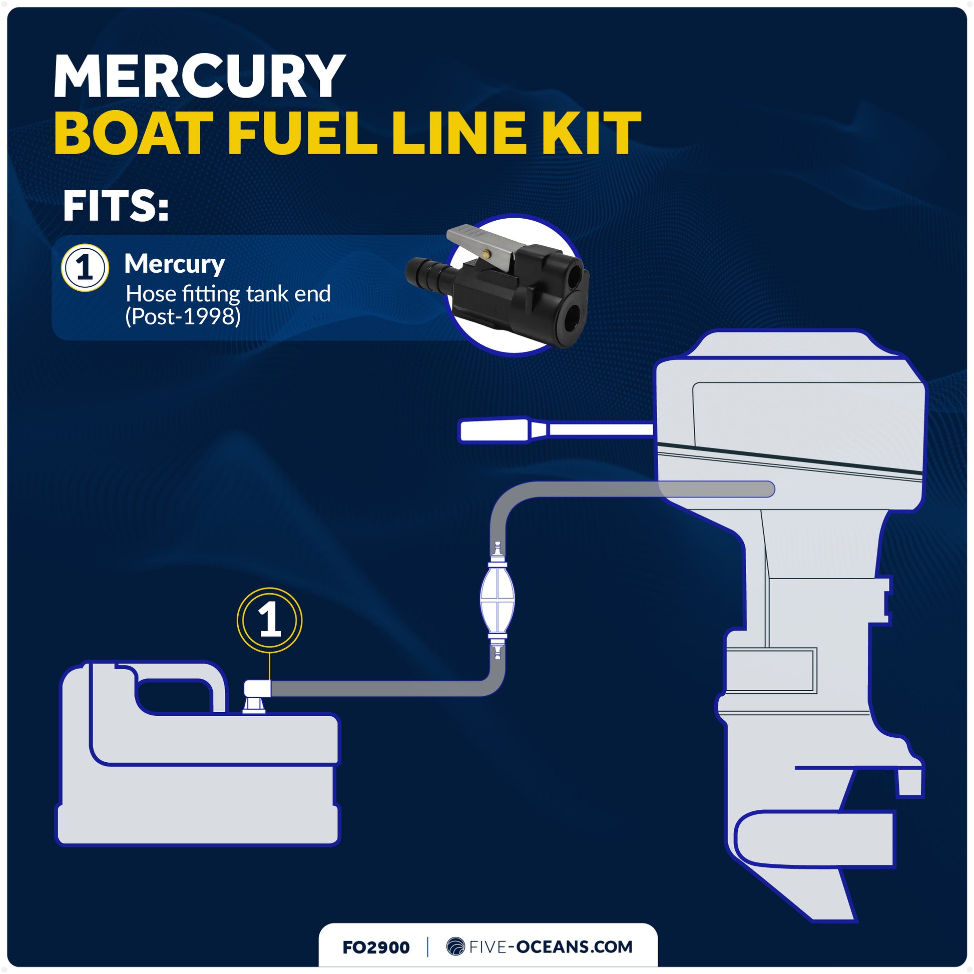 COMPATIBILITY: Female fuel line tank-end connector with 3/8-inch hose barb, compatible with Mercury outboards (post-1998). Direct replacement for OE part numbers 22-13563A6, 22-13563Q7, 22-13563T7.