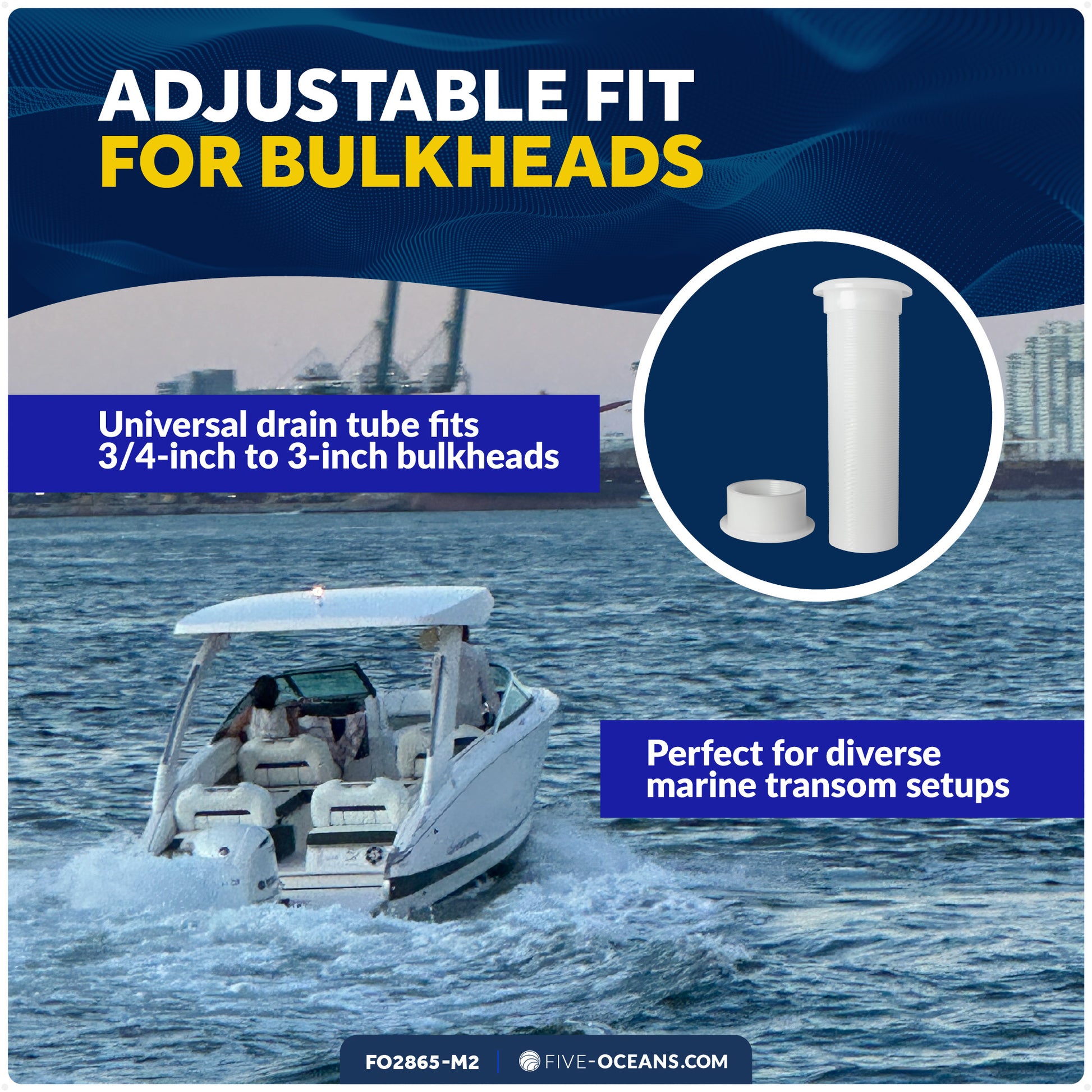 ADJUSTABLE FIT FOR BULKHEADS: Universal drain tube fits 3/4-inch to 3-inch bulkheads, perfect for diverse marine transom setups.