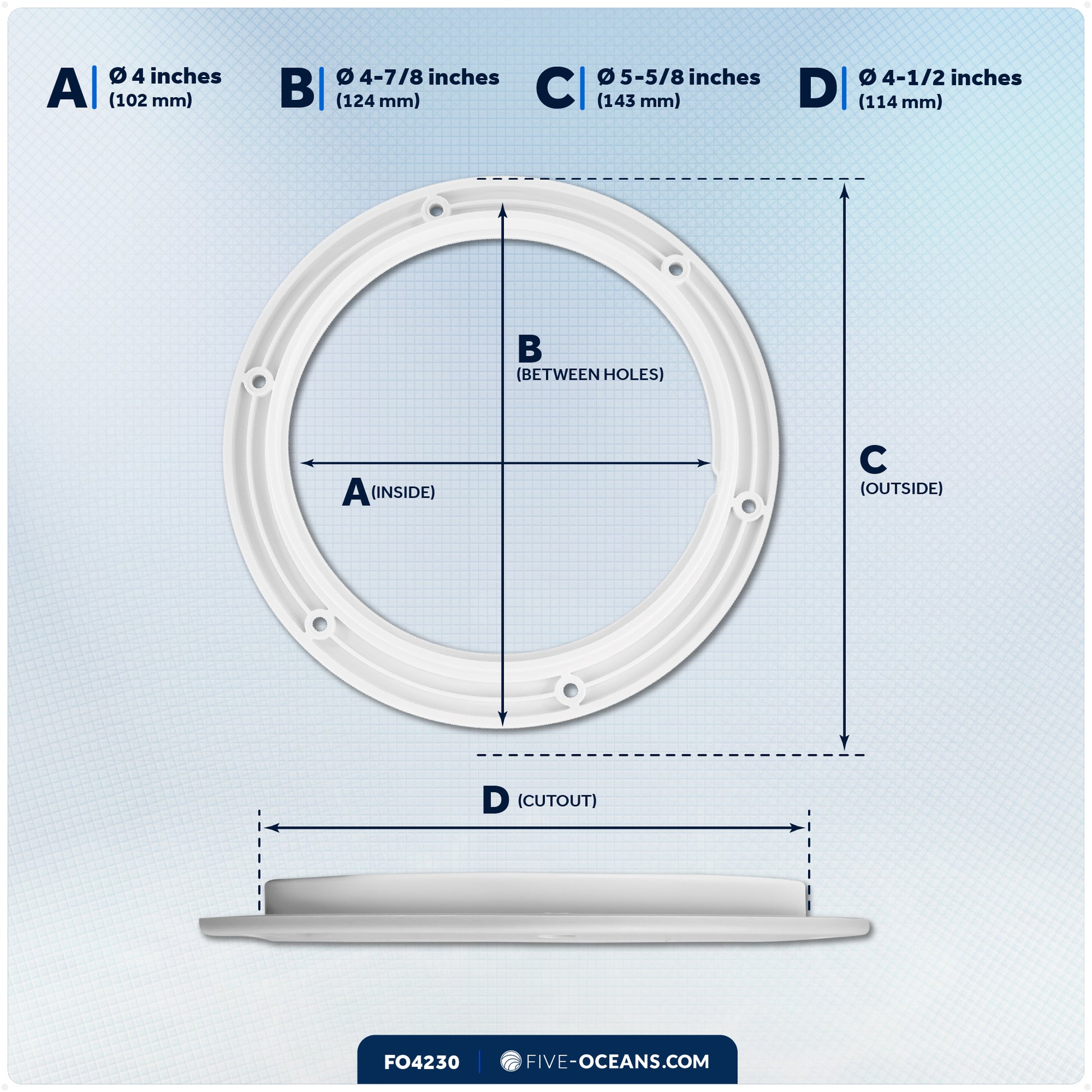 MEASUREMENTS: Inside Diameter: 4" (102mm), Outside Diameter: 5-5/8" (143mm), Cutout: 4-1/2" (114mm), Distance Between Mounting Holes: 4-7/8" (124mm).