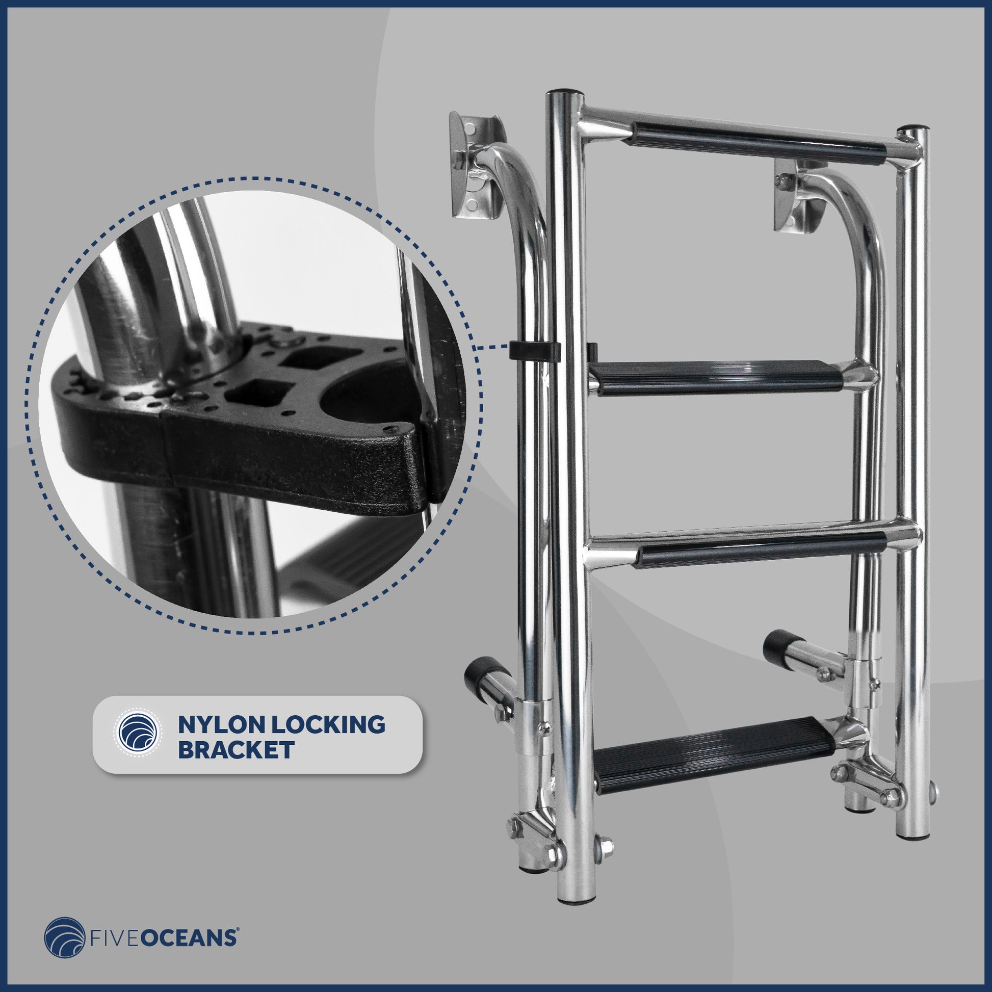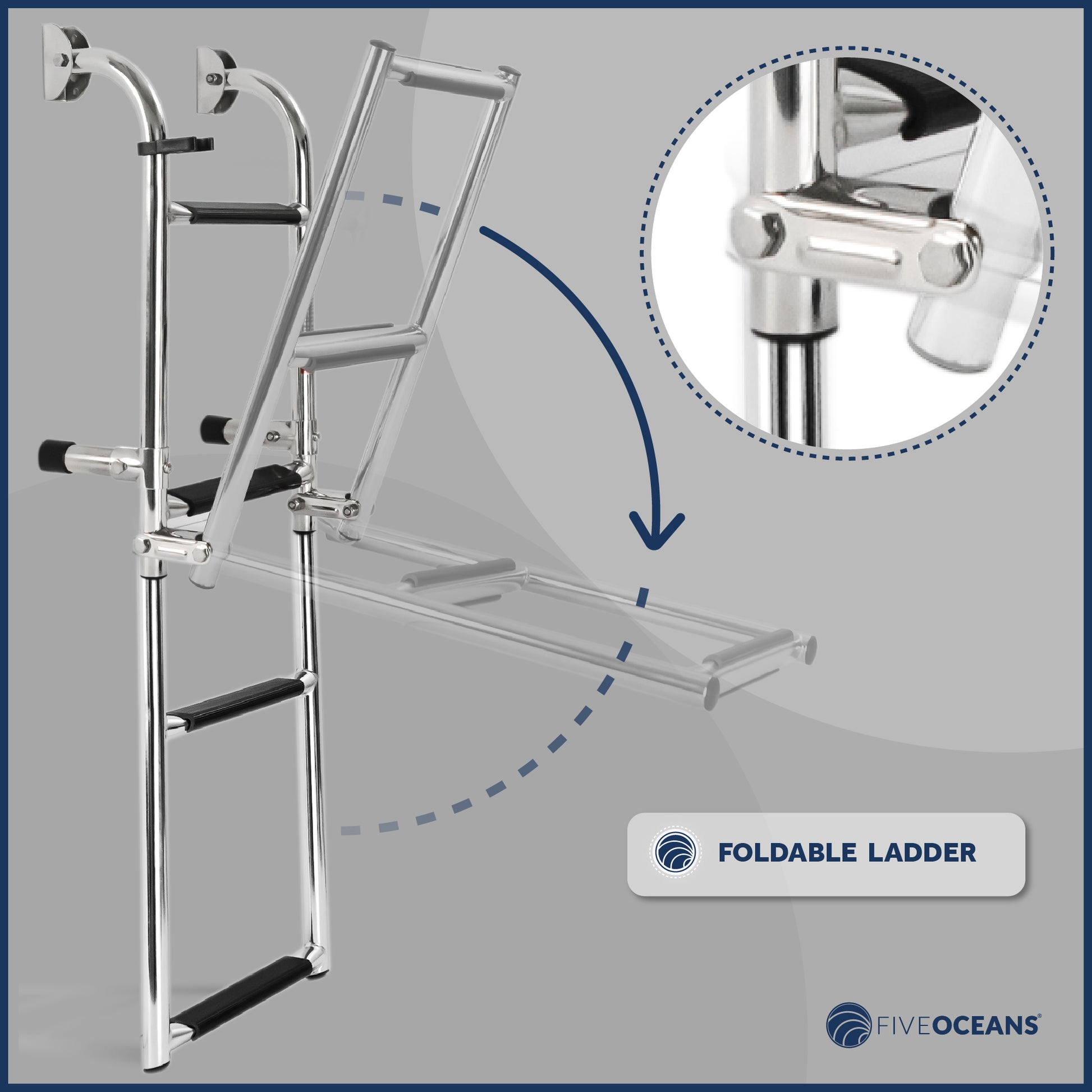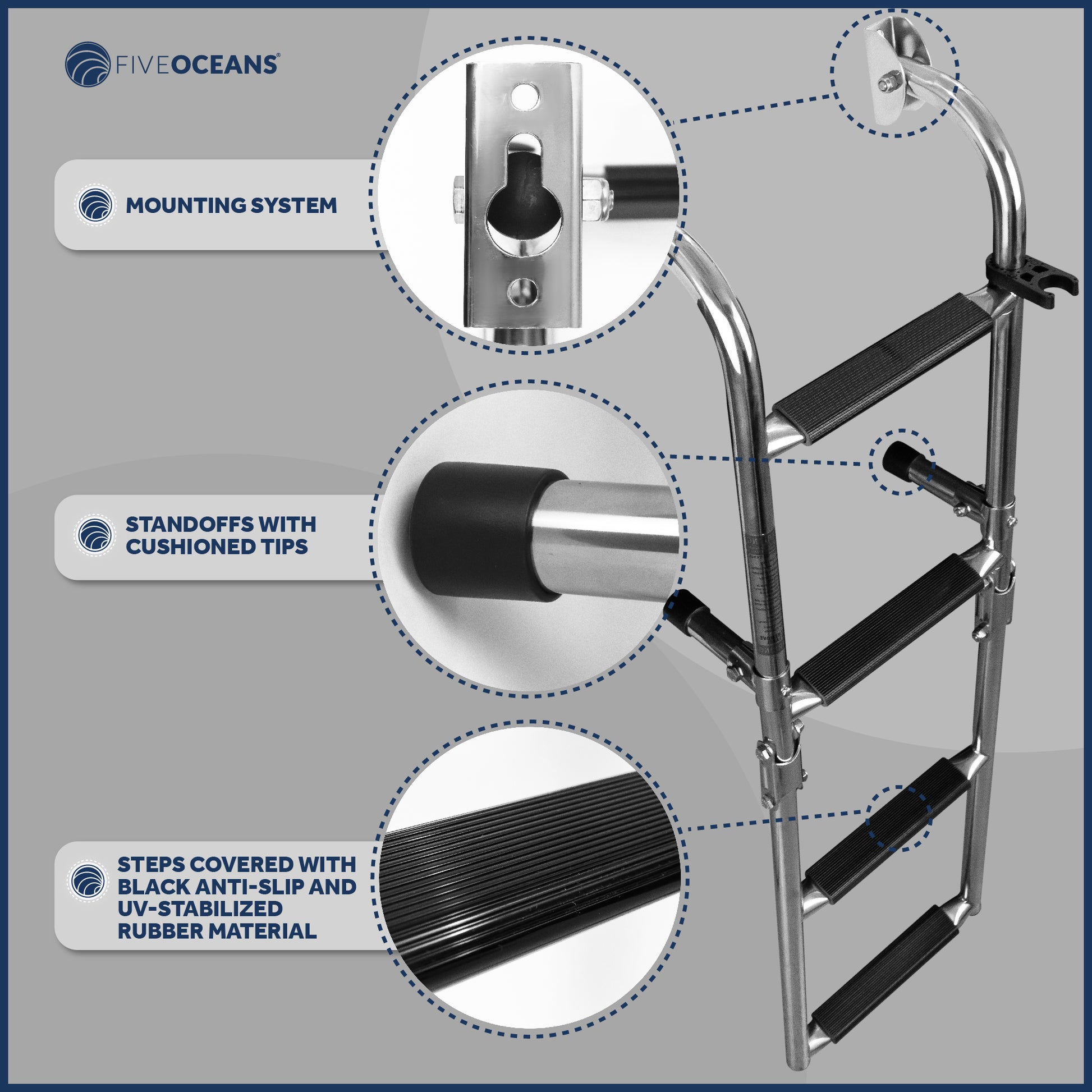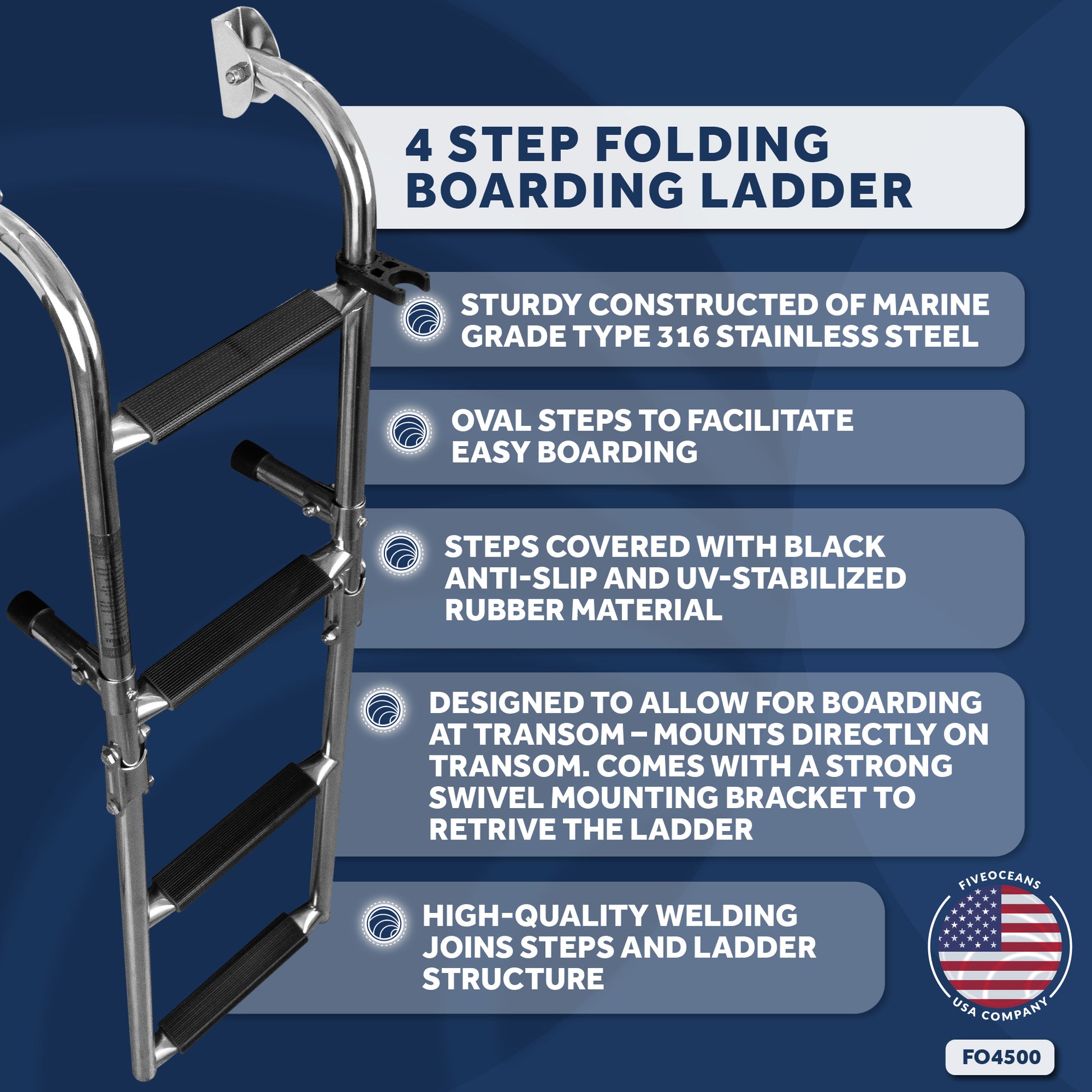 MARINE-GRADE MATERIALS: Five Oceans 4 Step Folding Boarding Ladder is Sturdy and Constructed of Marine Grade Type 316 Stainless Steel. High-Quality Welding Joins Steps and Ladder Structure. Steps are covered with black anti-slip and UV-stabilized Rubber Material.
