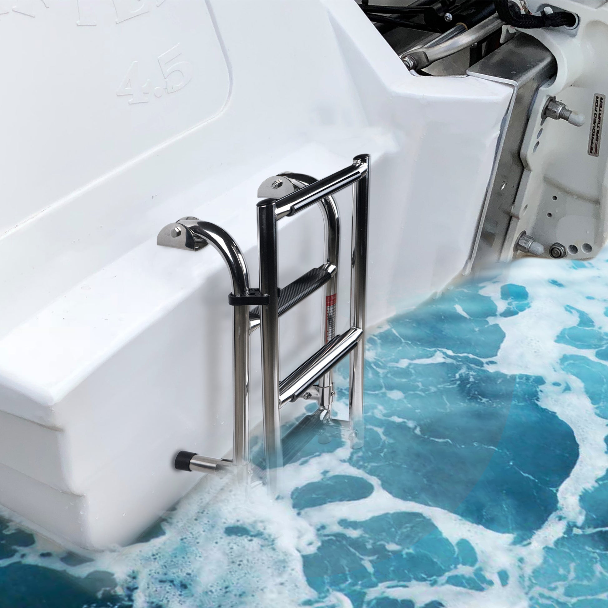 FOLDING DESIGN: Designed to allow for boarding at the transom - mounts directly on the transom. Comes with a strong swivel mounting bracket to retrieve the ladder. Oval Steps to facilitate easy boarding and ensure maximum grip for the user, reducing slippage.