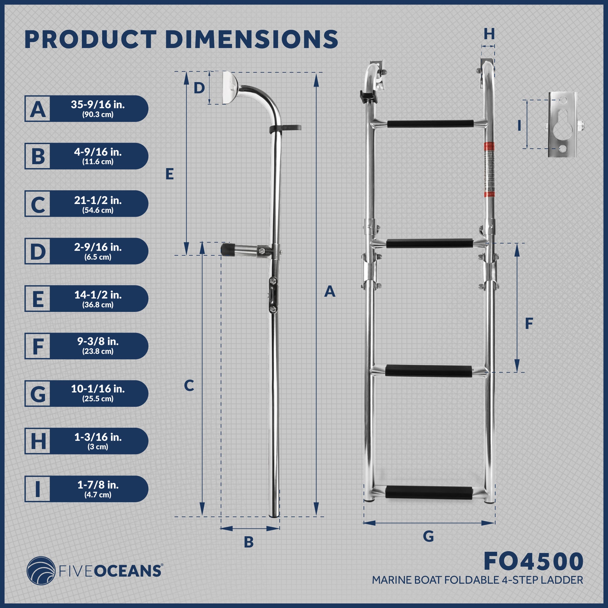 MARINE-GRADE MATERIALS: Five Oceans 4 Step Folding Boarding Ladder is Sturdy and Constructed of Marine Grade Type 316 Stainless Steel. High-Quality Welding Joins Steps and Ladder Structure. Steps are covered with black anti-slip and UV-stabilized Rubber Material.