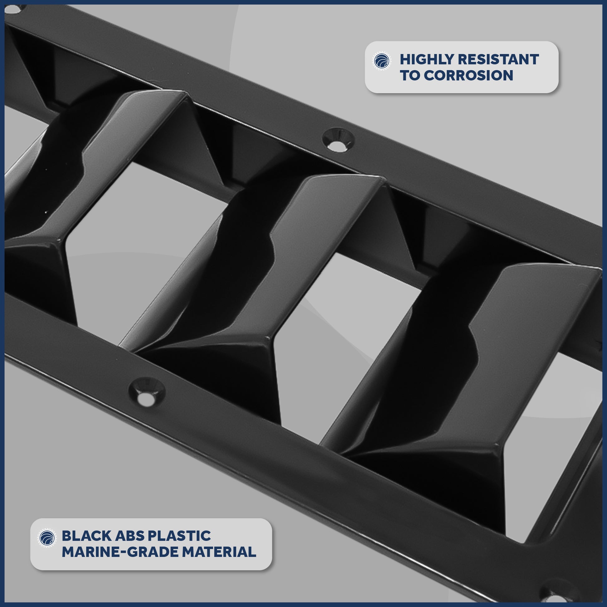 DURABILITY AND CORROSION RESISTANCE: Slotted louvered vent is made from black ABS Plastic marine-grade material which is highly resistant to corrosion caused by exposure to saltwater and marine environments.