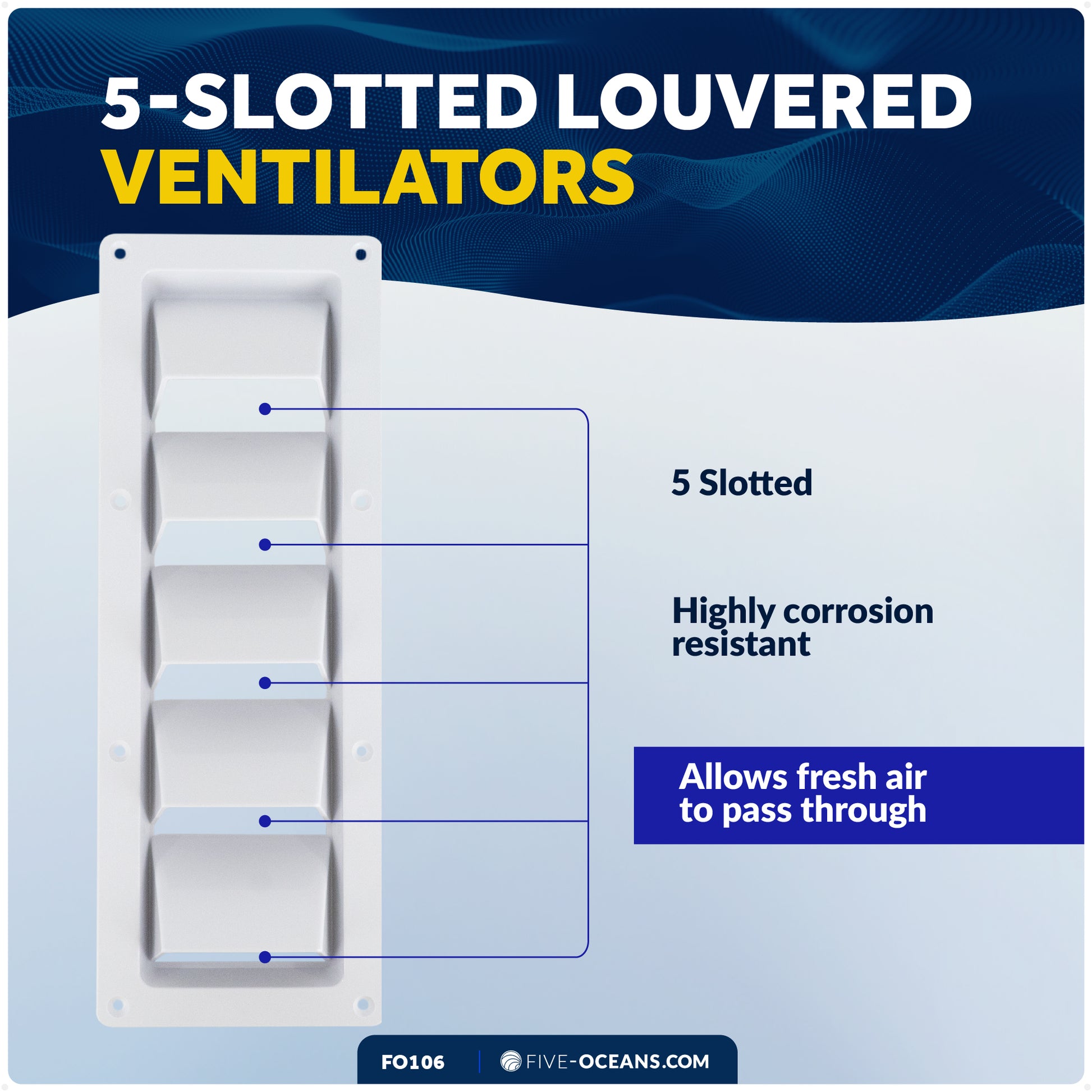 DURABILITY AND CORROSION RESISTANCE: Slotted louvered vent is made from white ABS Plastic marine-grade material which is highly resistant to corrosion caused by exposure to saltwater and marine environments.