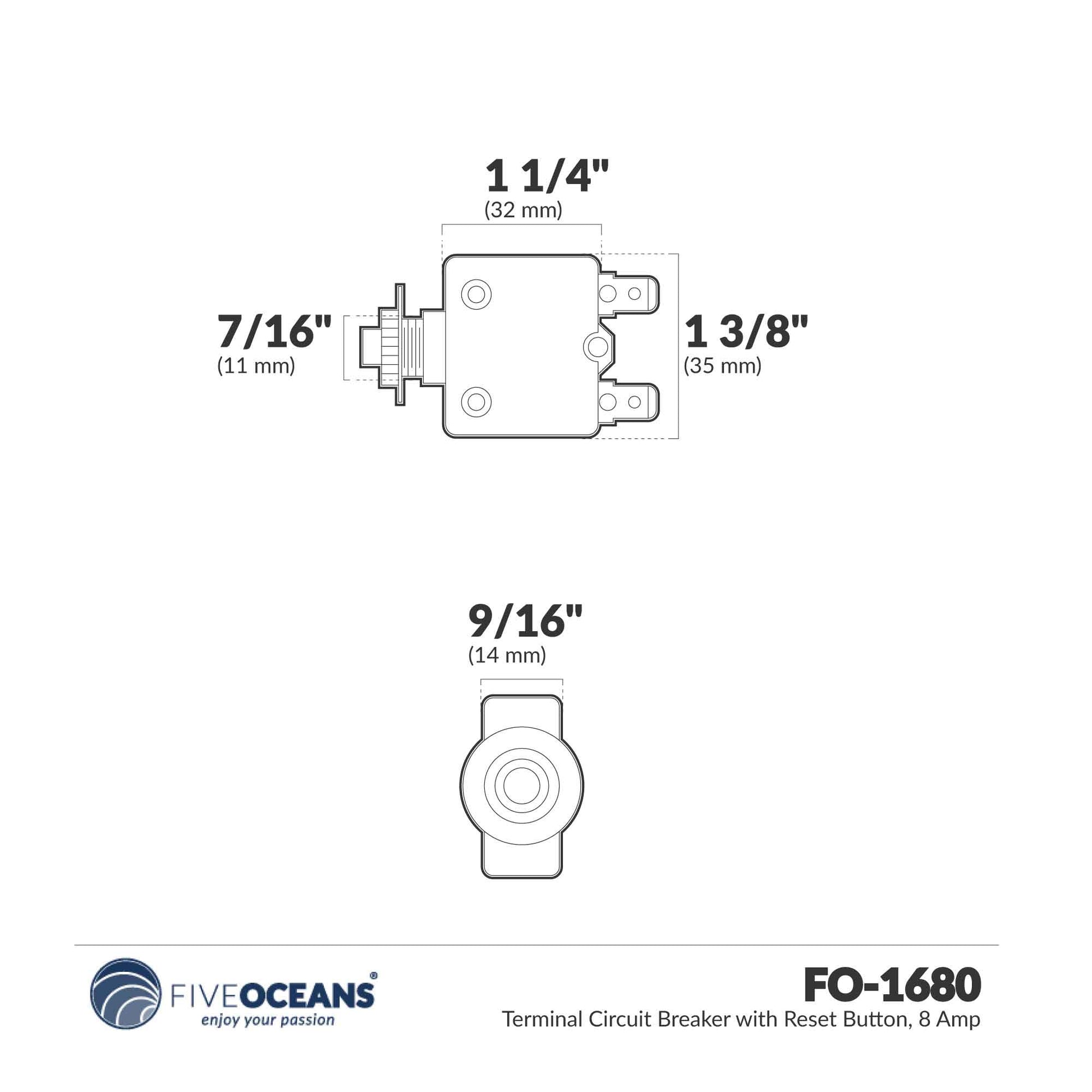 These Five Oceans terminal circuit breaker w/reset button support up to 8 amps. Compact, ignition protected design allows high-density DC circuit protection in tight quarters. Push-to-reset, "trip free" design cannot be held "ON" during fault conditions.