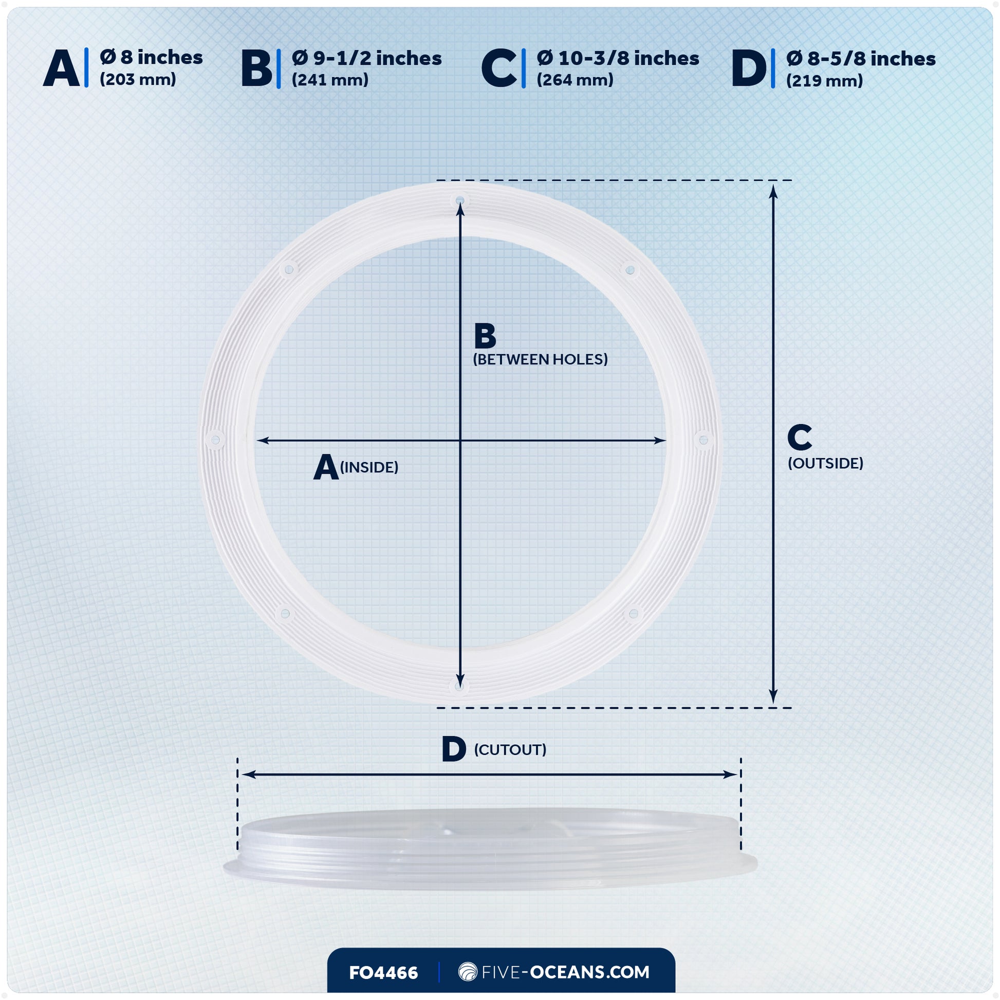 MEASUREMENTS: Inside Diameter: 8" (203mm), Outside Diameter: 10-3/8" (264mm), Cutout: 8-5/8" (219mm), Distance Between Mounting Holes: 9-1/2" (241mm).