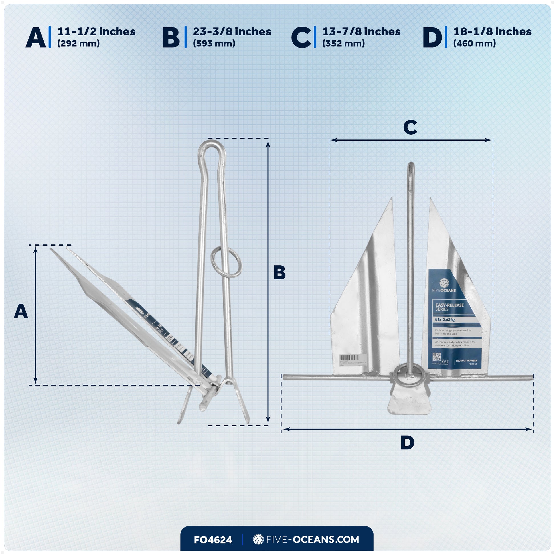 ANCHOR SPECS FOR BOATS: Weight: 8 Lb (3.63 Kg). Dimensions: 23-3/8 in. shank length, 18-1/8 in. stock width, 13-7/8 in. fluke length. A compact, heavy-duty anchor built for performance.