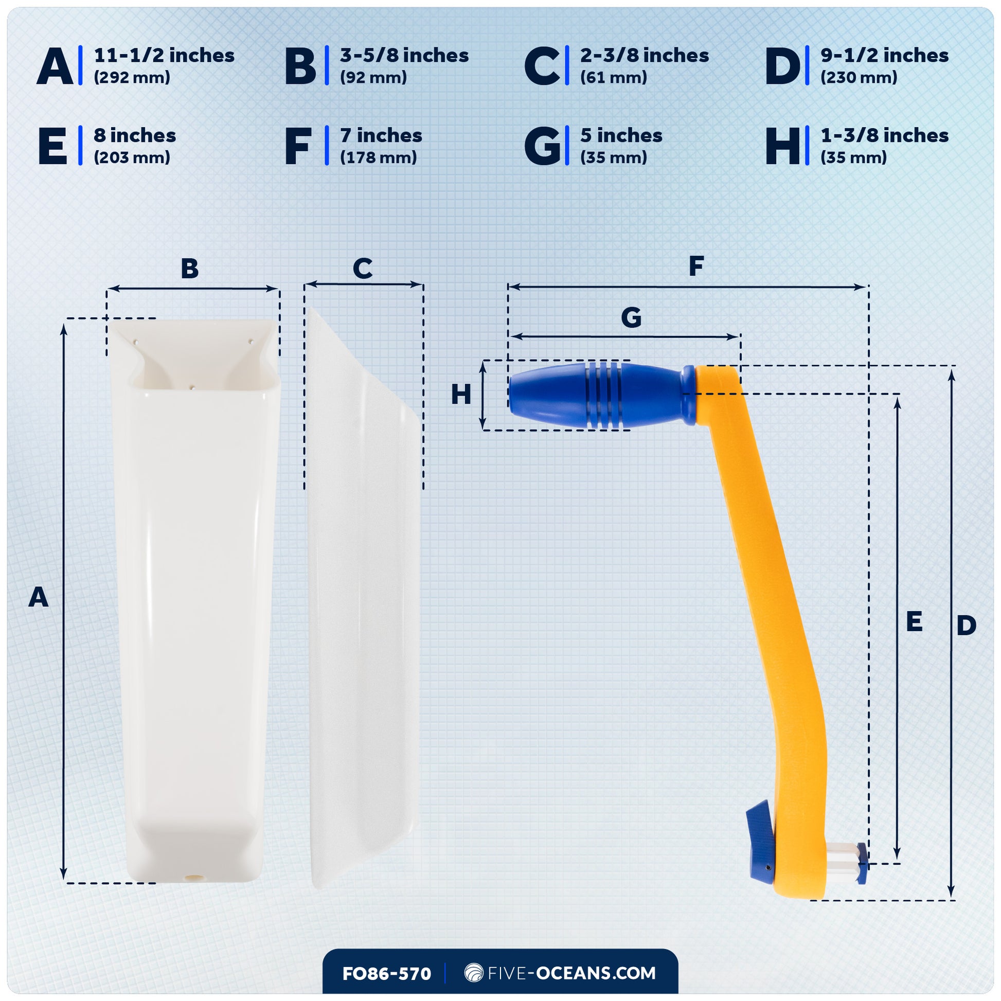 DURABLE & VERSATILE SET - The marine-grade winch handle measures 8 inches (203 mm), weighs just 0.62 lb, and is available in high-visibility orange and blue. The holder is compatible with standard or lock-in winch handles up to 10 inches. It is crafted from UV-stabilized, non-corrosive white PVC and measures 11-1/2" (292 mm) in length, 3-5/8" (92 mm) in width, and 2-3/8" (61 mm) in height for durability in harsh marine conditions.