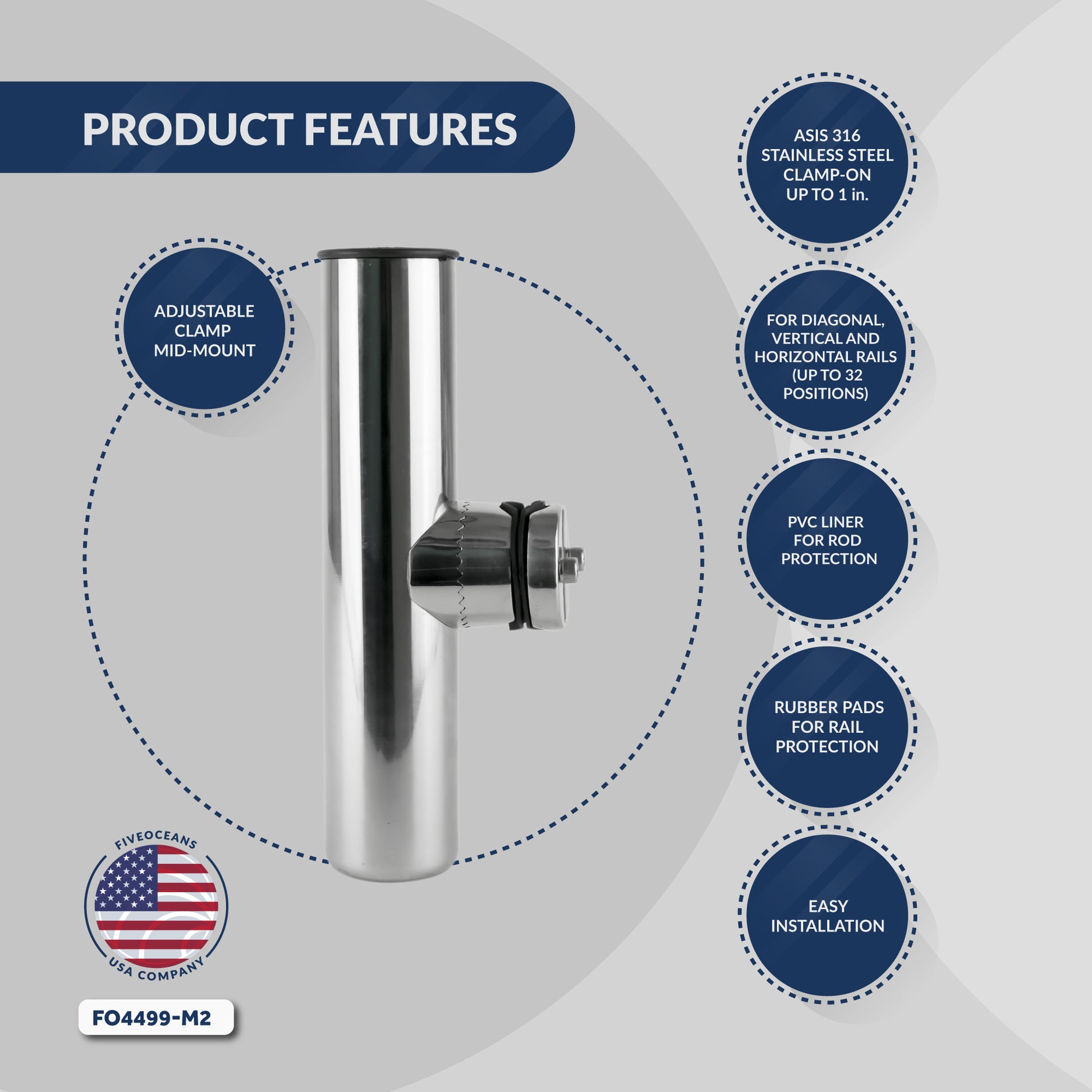 This Five Oceans Clamp on Fishing Rod Holder Stainless Steel for Rails 7/8 to 1 inch is Made of AISI316 Stainless Steel which is highly resistant to rust and corrosion, even when exposed to saltwater. A protective, UV-resistant PVC liner keeps your rod free of scratches and scuffs, and a gimbal pin helps keep your rod from spinning. Plus, drain holes are incorporated into the bottom of the rod holder to help keep water from pooling. Easy Installation with a mounting bracket that includes bolts (Allen wrench is Not Included). This Fishing Rod Holder Comes with Two (2) rubber pads inside the clamps are included that fit between the rail and the mounting bracket. It protects the rails from scratch too. No drilling is required for installation.