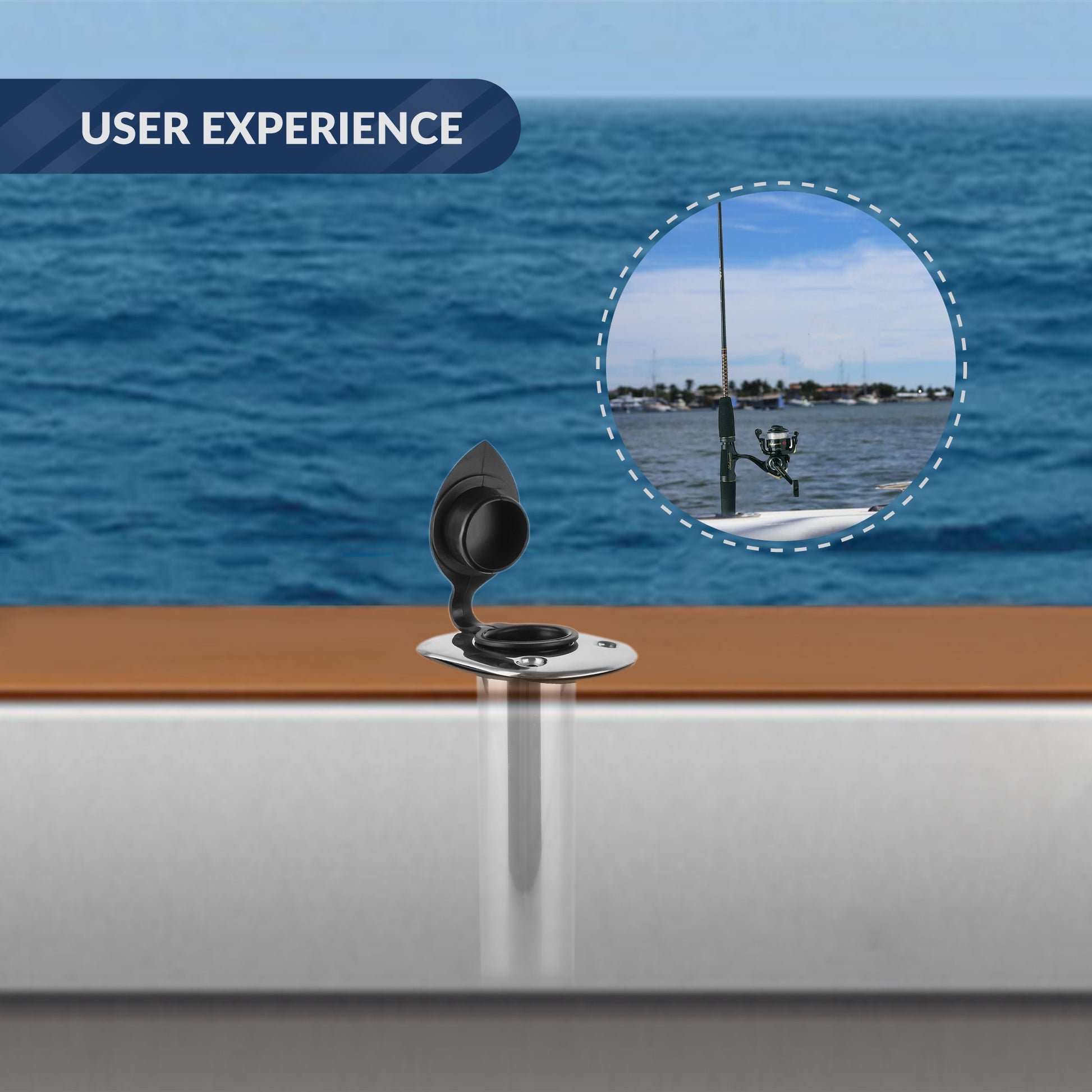 The opening has a black UV-resistant PVC that protects the finish on the rod and reel. There is an oval-shaped top flange at a 30-degree angle, and the base, which mounts flush to the surface, is open.