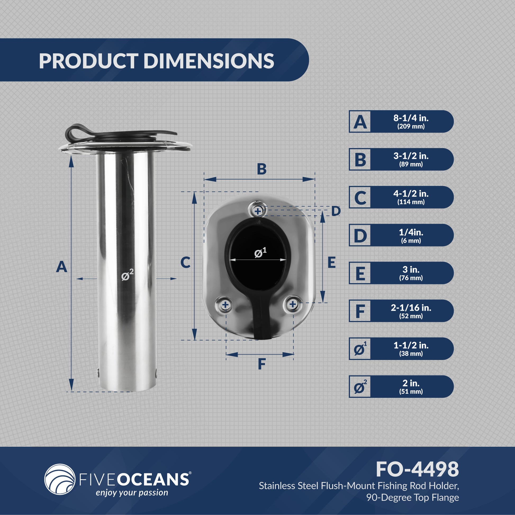 This Five Oceans Flush Mount Rod Holder 90-Degree is made of AISI316 Stainless Steel and PVC UV Resistant Flip-up Cap to Resist the conditions of the Marine Environment. This Rod Holder has a 1 1/2 inches (50.8mm) diameter center opening for the rod handle.