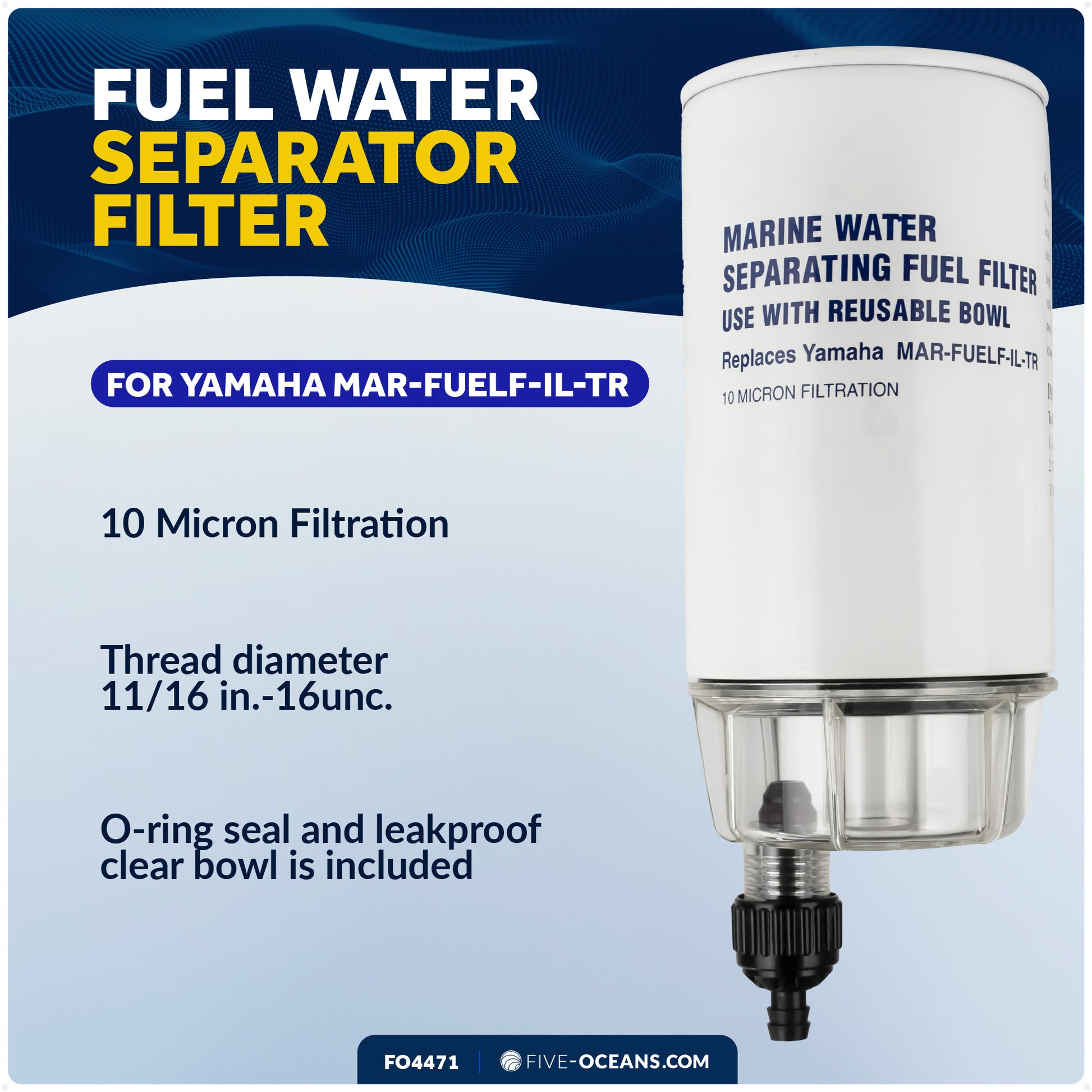 HIGH-QUALITY YAMAHA WATER FUEL SEPARATOR FILTER: Five Oceans fuel filter water separator with bowl offer a 92% efficiency rate while maintaining fuel flow rates to meet the demands of modern high-performance engines. Filtration: 10 microns.