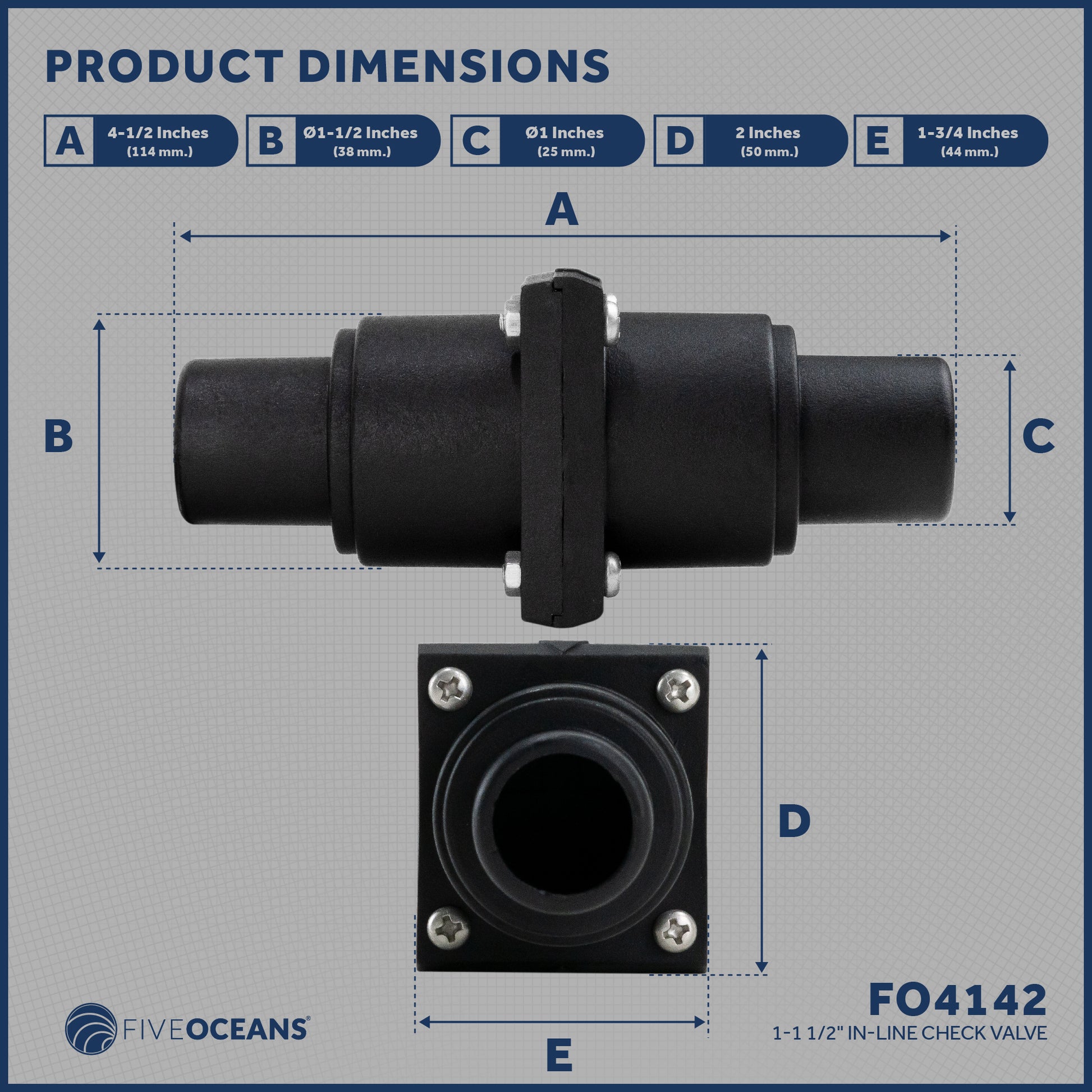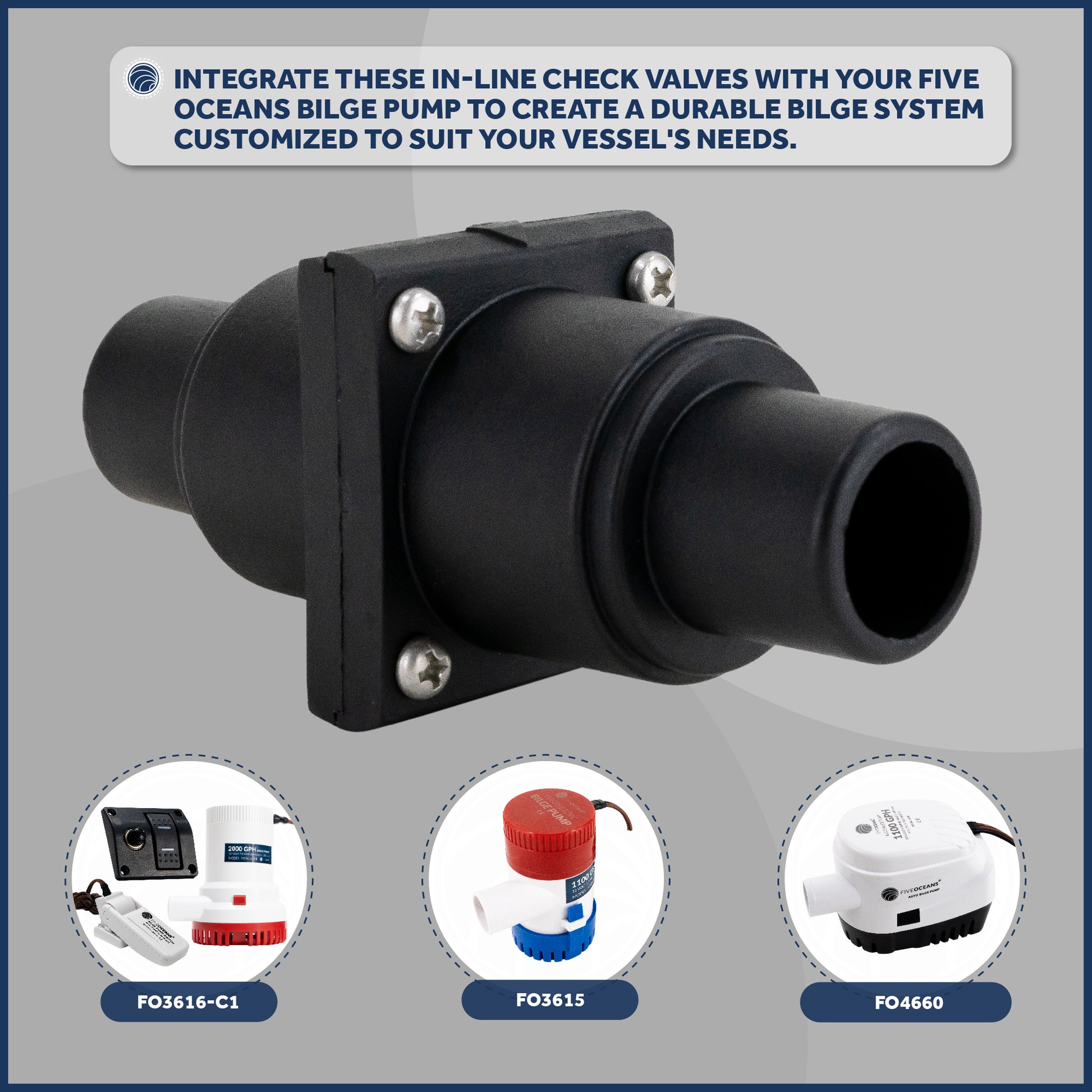 A GREAT ACCESSORY - One way check valve: Integrate these In-line Check Valves with your Five Oceans bilge pump to create a durable bilge system customized to suit your vessel's needs.