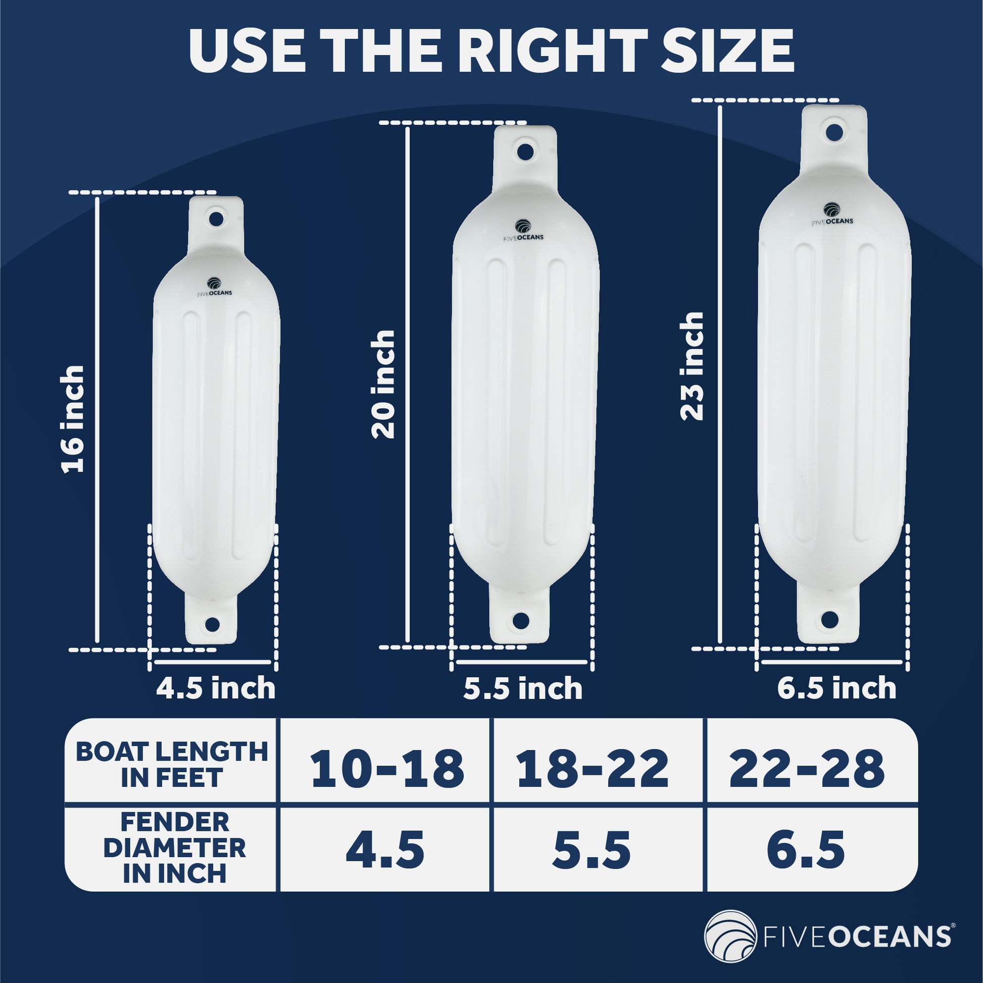 BOAT BUMPER PACK INCLUDES: 4 white boat fenders for docking 5.5 x 20 Inch, 4 boat fender rope lines 3/8 Inch, 1 Pump, and 4 needles to inflate or deflate each fender to a desired pressure.