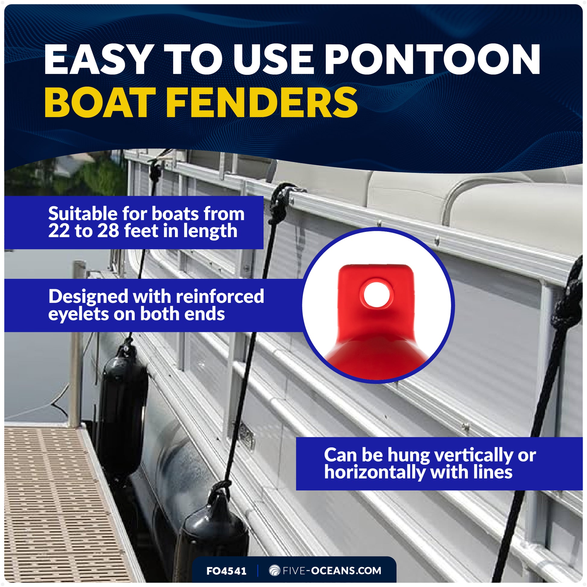EASY TO USE PONTOON BOAT FENDERS: Suitable for boats with lengths of 22 to 28 feet. Frequently used in pontoons, fishing boat, sport boats, day cruisers, sailboats, jet skis, and bass boats. Pontoon fenders are designed with reinforced eyelets on both ends, they can be hung with lines vertically or horizontally.