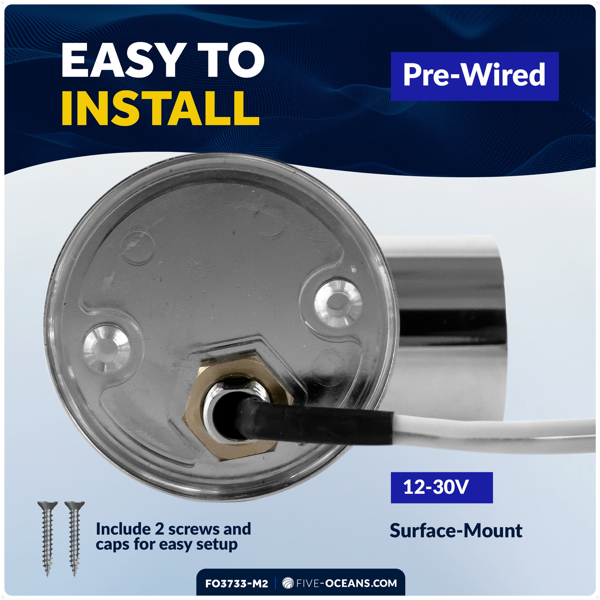 EASY INSTALLATION: Compact (3 5/16" H, 2" base, 1 3/8" lens); pre-wired, surface-mount design with 2 stainless steel screws included for quick setup.