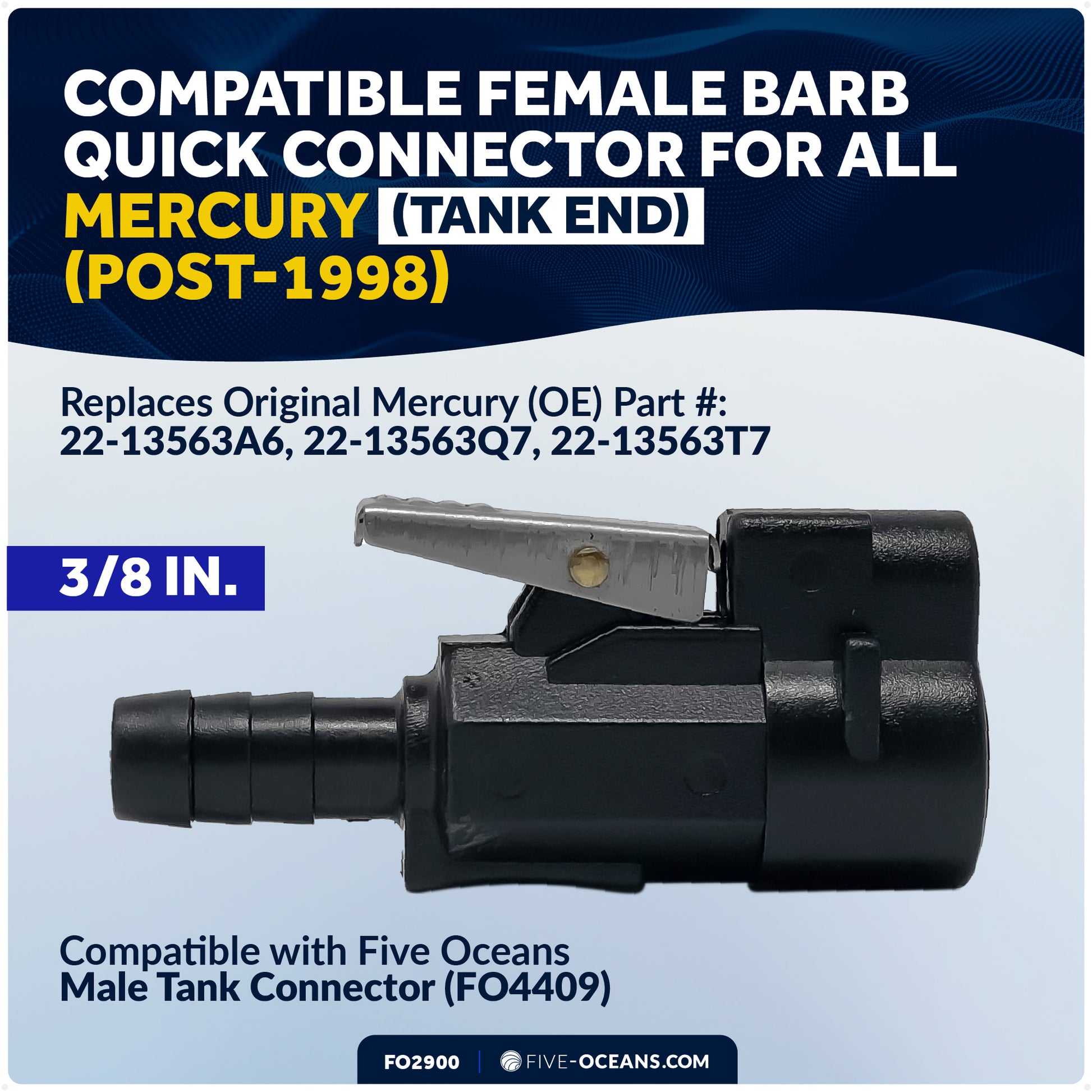 COMPATIBILITY: Female fuel line tank-end connector with 3/8-inch hose barb, compatible with Mercury outboards (post-1998). Direct replacement for OE part numbers 22-13563A6, 22-13563Q7, 22-13563T7.