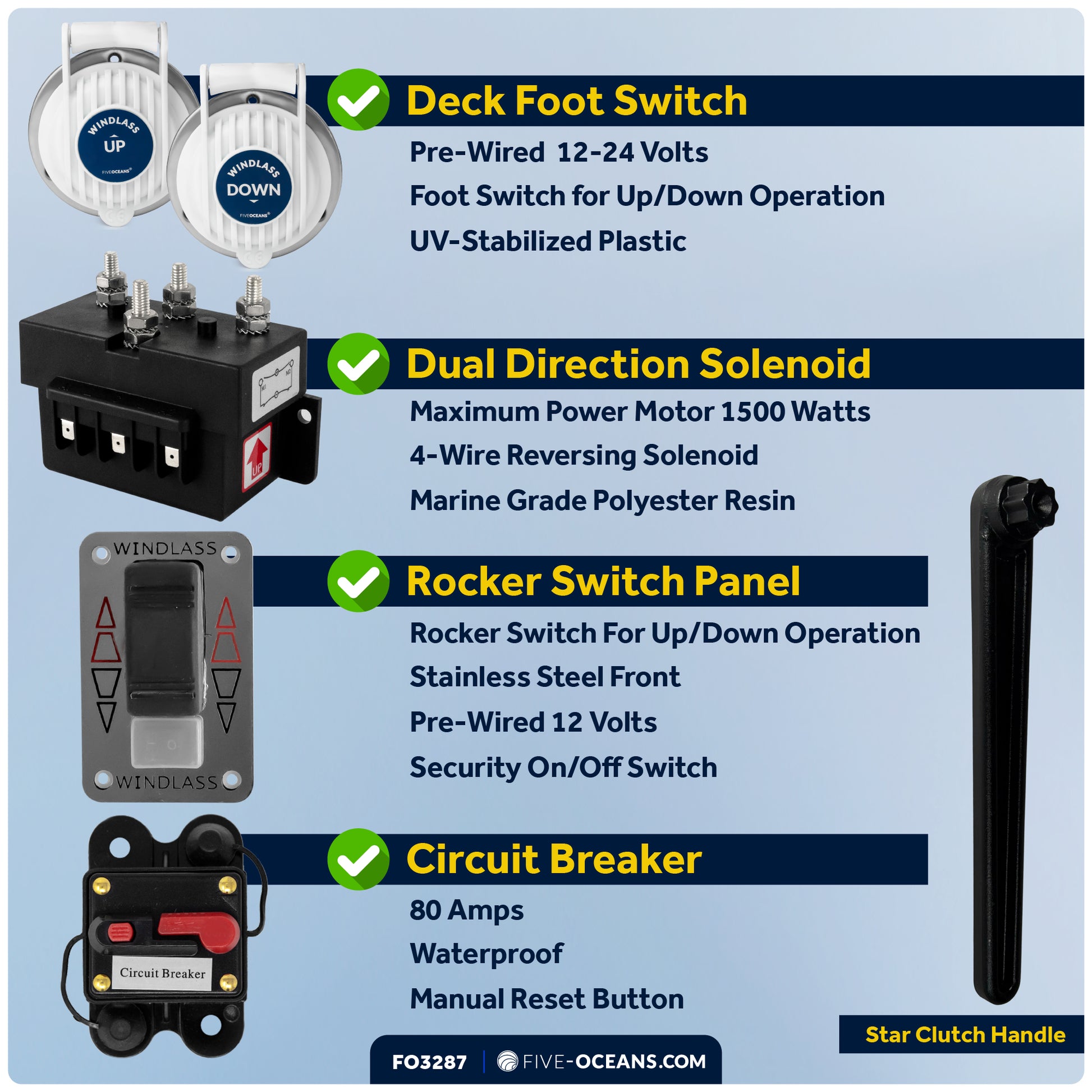 WINDLASS ANCHOR SYSTEM MODEL: Pacific 900 Series. Vertical Windlass. Motor Supply Voltage: 12V. Motor Power: 900 Watts. Gypsy: Chain and Rope. Includes 4-Wire Solenoid, 80A Circuit Breaker, Up/Down Foot Switch, Rocker Switch, Manual Top-Cap Handle, Owner Manual, Mounting Hardware, and Mounting Template.