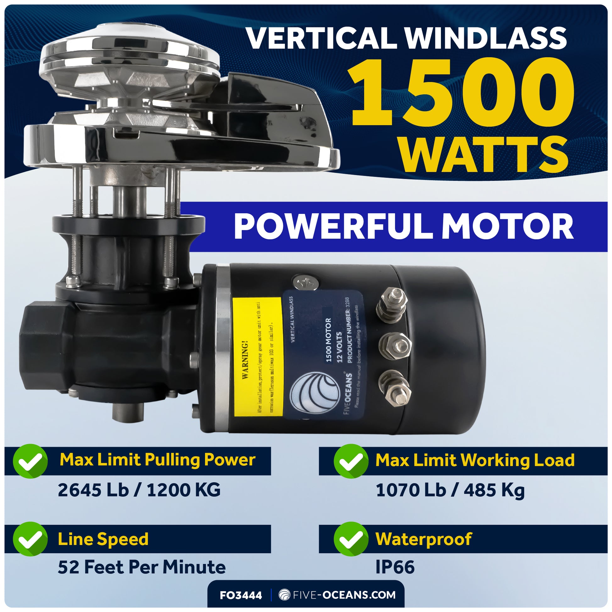 HIGH-PERFORMANCE ANCHOR MOTOR: The High-Power 1500 Watts provides a maximum pulling power of 2645 Lb / 1200 Kg and a maximum working load of 800 Lb / 400 Kg. It allows a drop speed of 52 feet per minute. Waterproof IP66 rating motor. The five Oceans Windlass model number indicates Windlass's electric motor power (Watts), not the pulling power. Electric motor power (Watts) is the most important value when choosing a windlass for your boat.