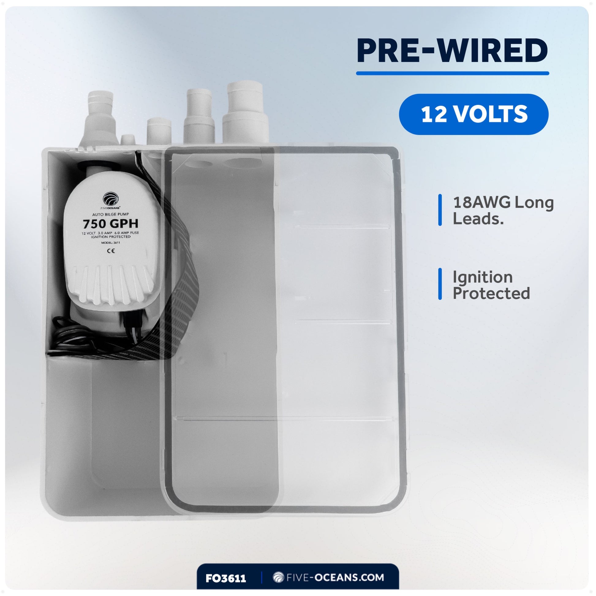 ALL-IN-ONE PUMP WITH INTEGRATED FLOAT SWITCH - Features an automatic On/Off system for hassle-free operation. Flow capacity: 750 GPH (2839 LPH). Voltage: 12V. Ignition protected with 18AWG long leads for secure connections.
