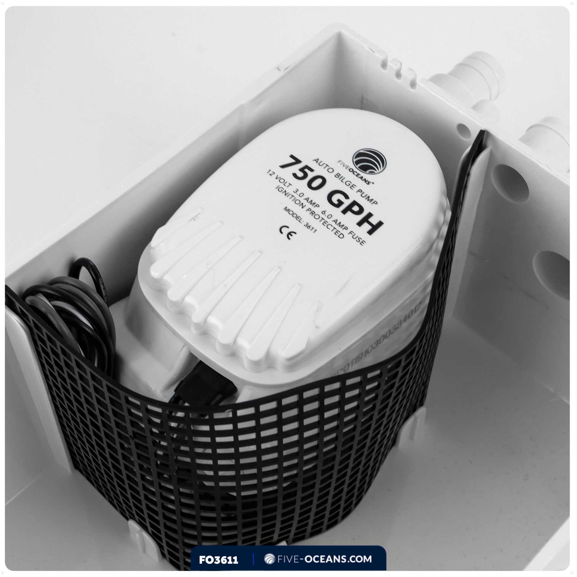 ALL-IN-ONE PUMP WITH INTEGRATED FLOAT SWITCH - Features an automatic On/Off system for hassle-free operation. Flow capacity: 750 GPH (2839 LPH). Voltage: 12V. Ignition protected with 18AWG long leads for secure connections.