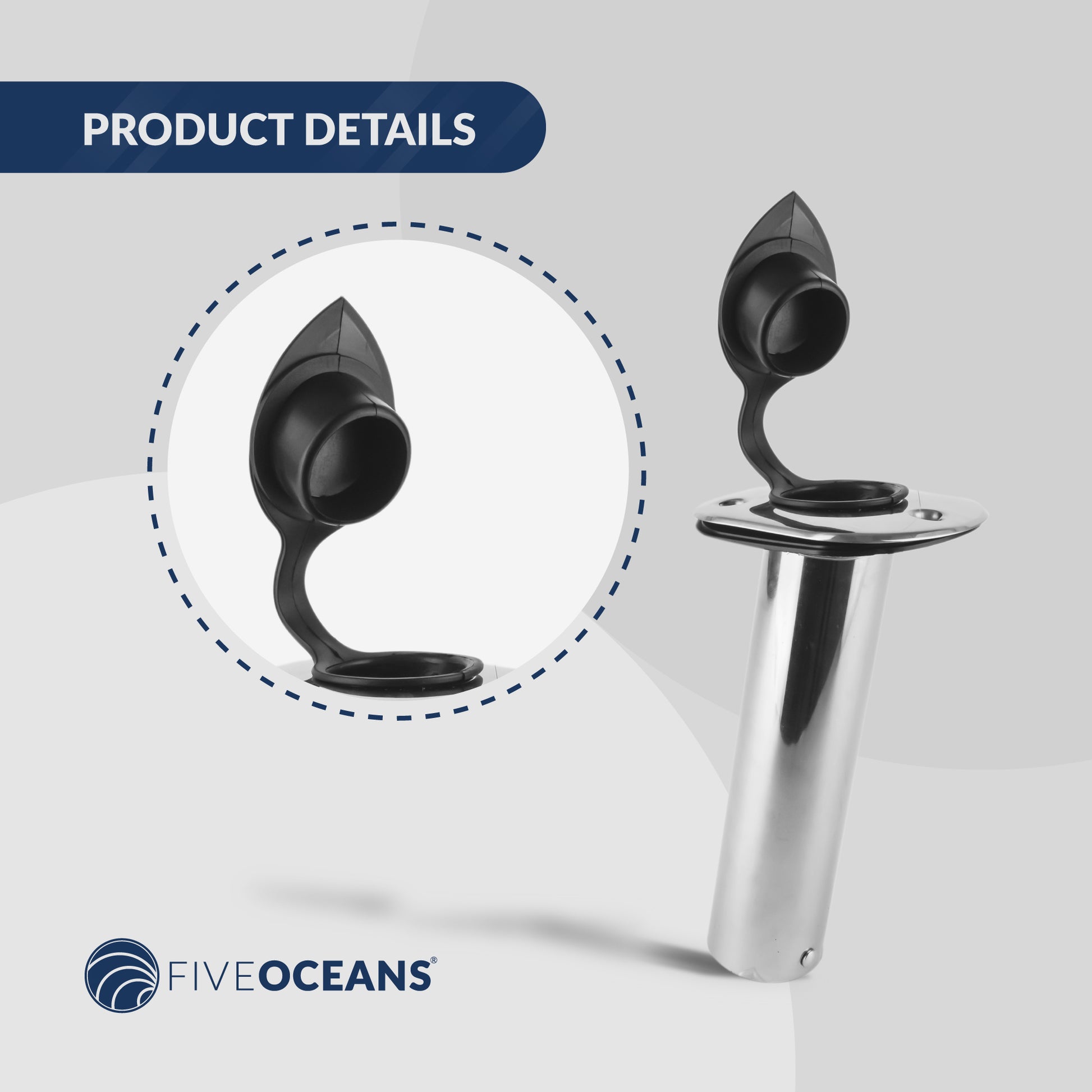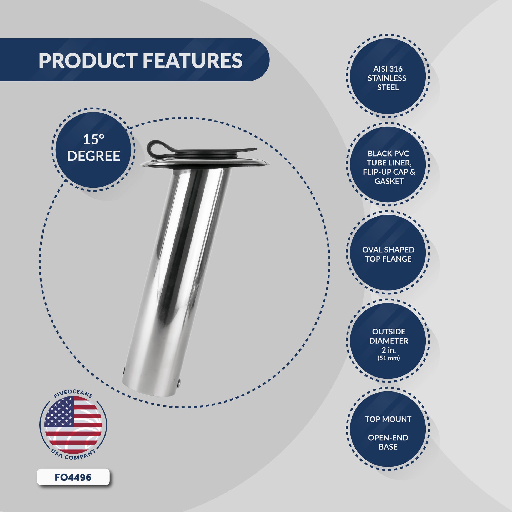 This Five Oceans Flush Mount Rod Holder 15-Degree is made of AISI316 Stainless Steel and PVC UV Resistant Flip-up Cap to Resist the conditions of the Marine Environment. This Rod Holder has a 1 1/2 inches (50.8mm) inside diameter center opening for the rod handle.