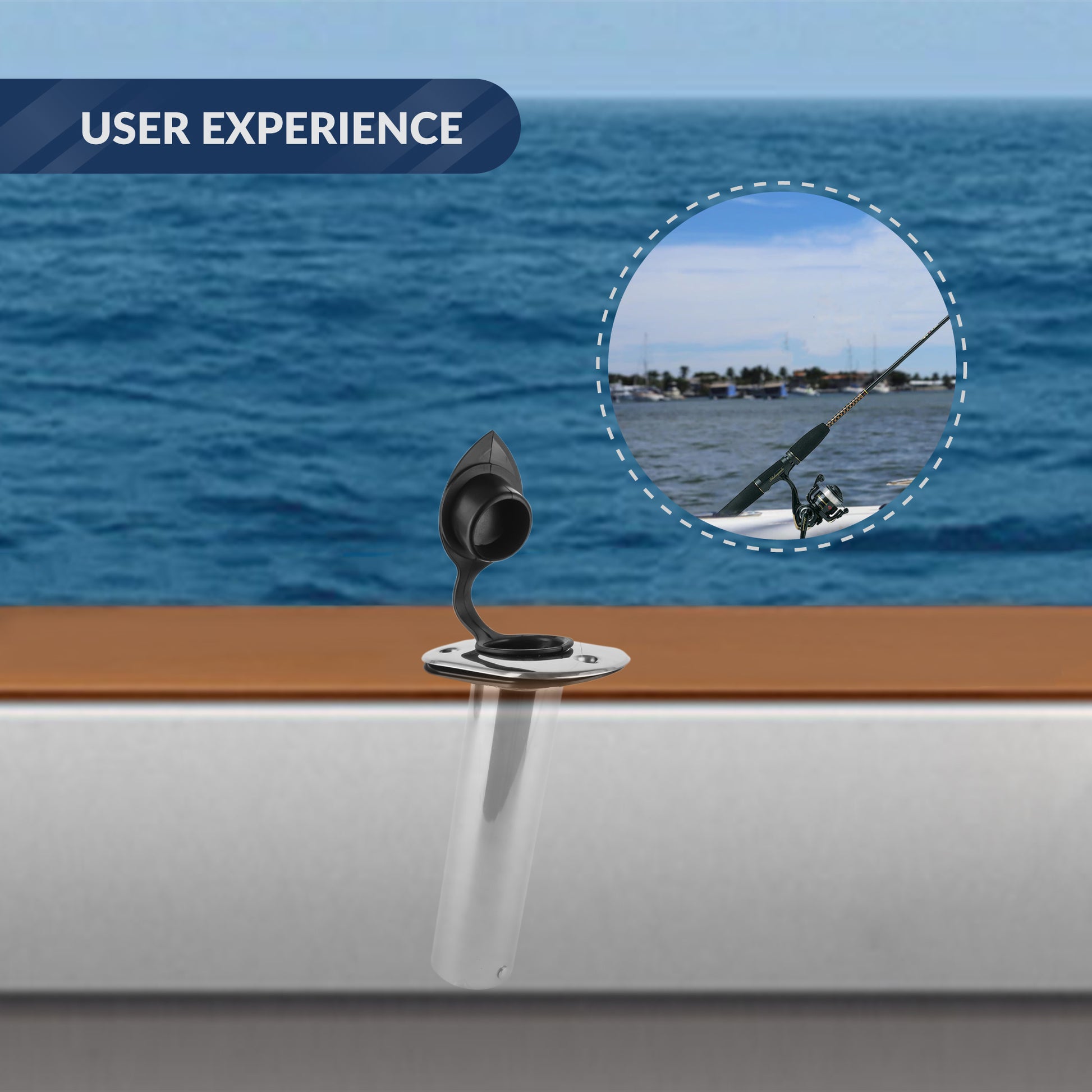 The opening has a black UV-resistant PVC that protects the finish on the rod and reel. There is an oval-shaped top flange at a 15-degree angle, and the end base, which mounts flush to the surface, is open.