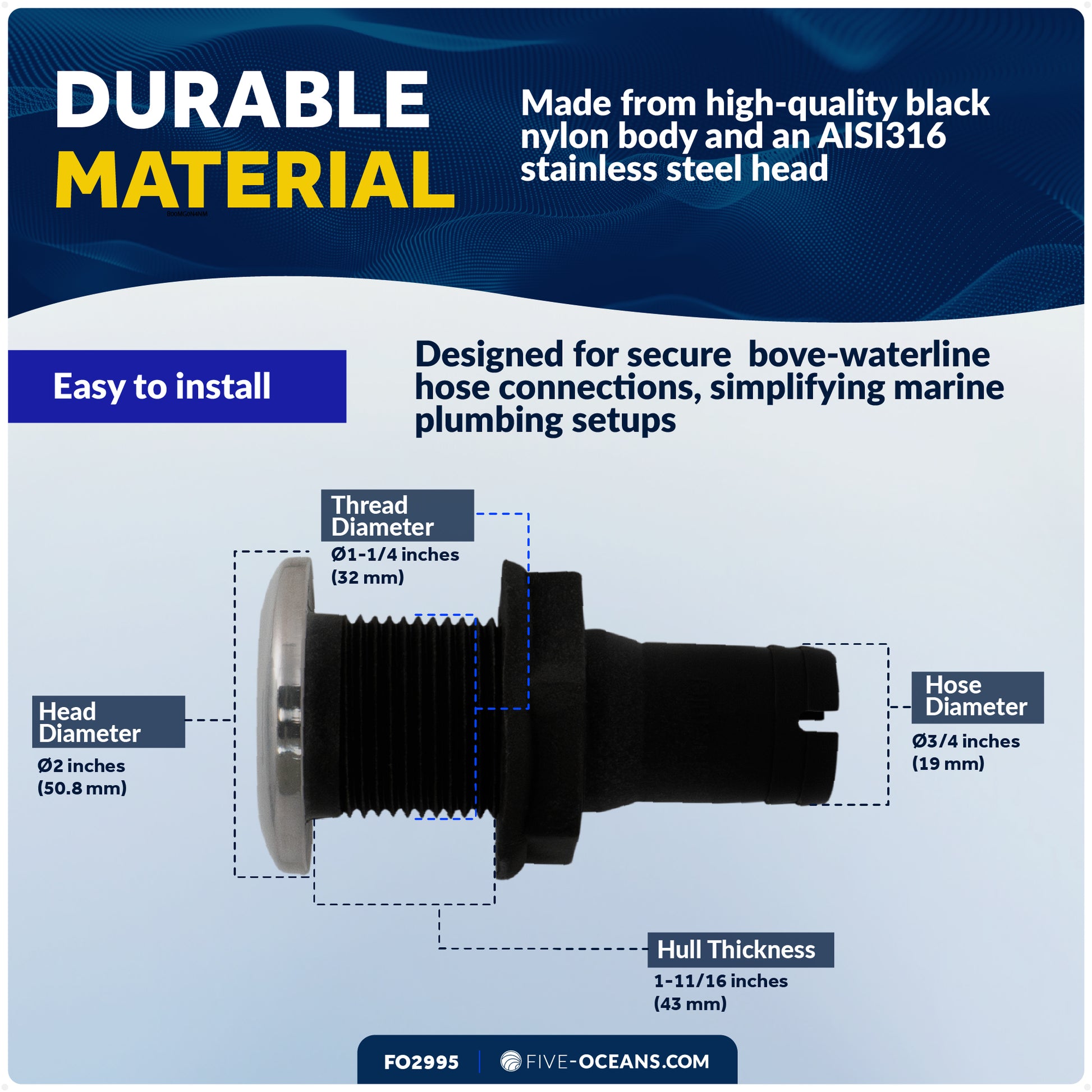 DURABLE CONSTRUCTION: This through-hull fitting offers exceptional durability with a rugged nylon body and an AISI316 stainless steel head, providing resistance to sunlight, saltwater, and harsh marine conditions for long-lasting use.